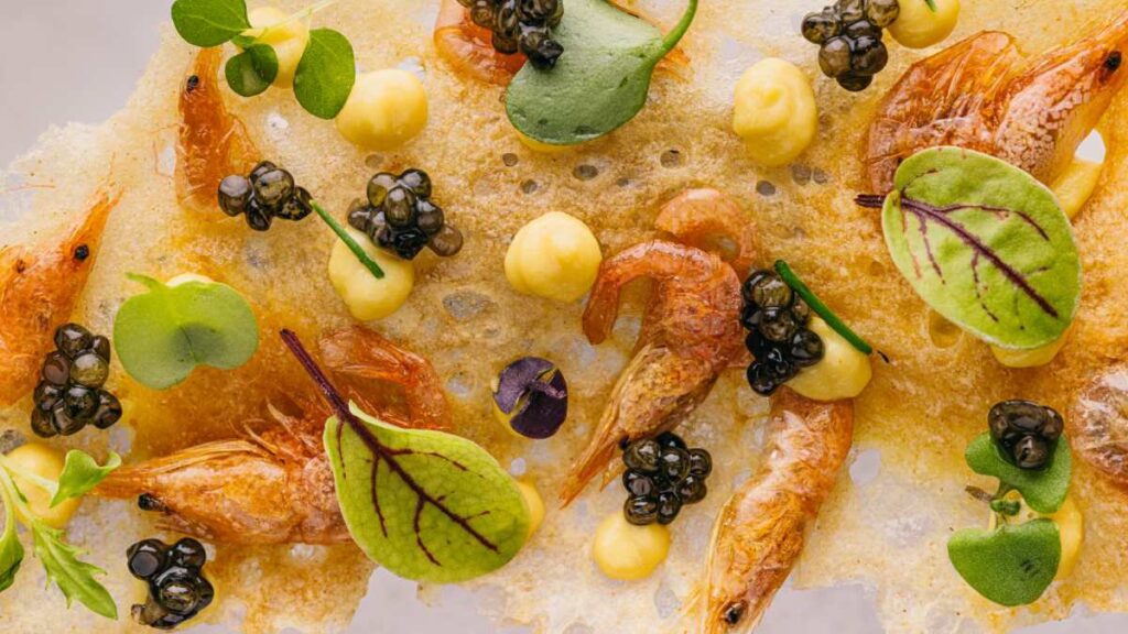 Después, empieza el espectáculo de sabores con platos como la ensalada de tomate cherry confitado, balsámico 50 años, sorbete de tomate pera y trufa negra; la exquisita quisquilla de Motril al natural con su propio jugo, aceite de huacatay y kombu; el huevo en pasta kataifi, con ají de gallina y caviar ahumado o el dumpling chino de ragú de calamares, shiitakes y laksa.