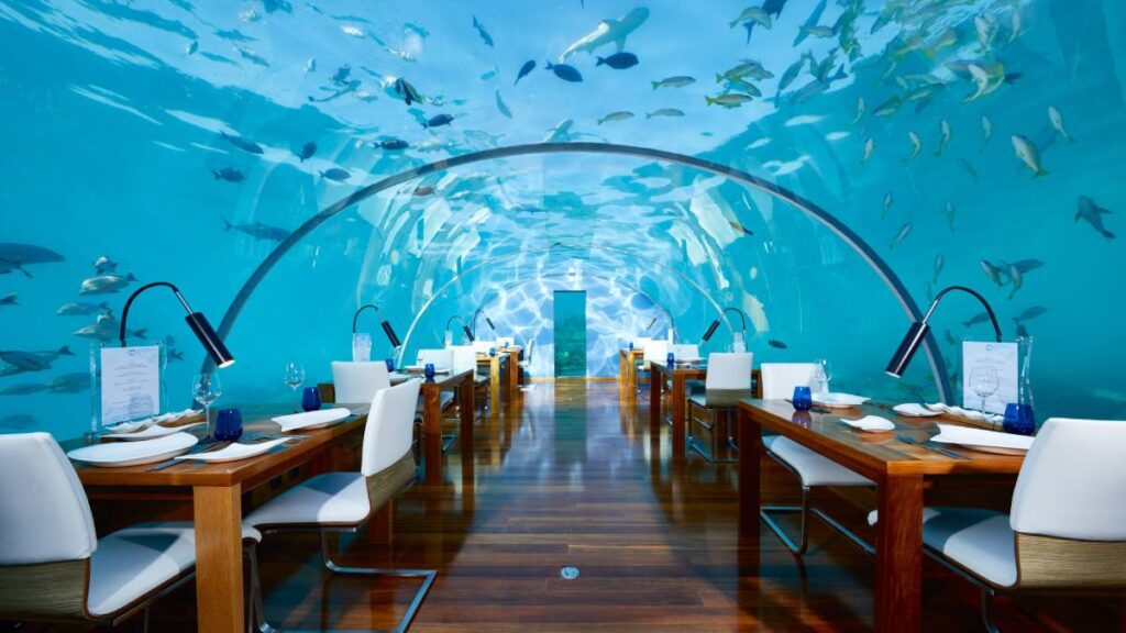 Another one of the undersea restaurants in the Maldives, specifically at the Anantara Kihavah luxury resort. Here you will experience a gourmet meal under the ocean. It has the first undersea wine cellar and its dining room is surrounded by sharks, turtles and tropical fish swimming around while diners experience haute cuisine. Gourmet meals under the ocean waves in an undersea restaurant. They have a 7-course tasting menu for €553, including food and wine pairing. Some of its highlights are dishes such as lobster salad, Scottish salmon, sea bass and its triumphant dessert, the chocolate explosion.