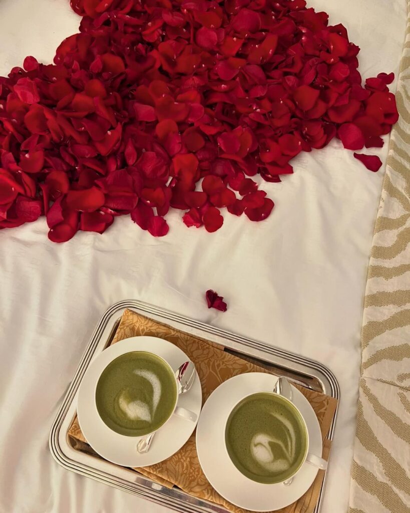 In another shared snapshot, she and Barker are seen enjoying a glass of wine in red bodysuits amidst an idyllic natural setting, while another is a gastronomic one of a still life with heart-shaped waffles.