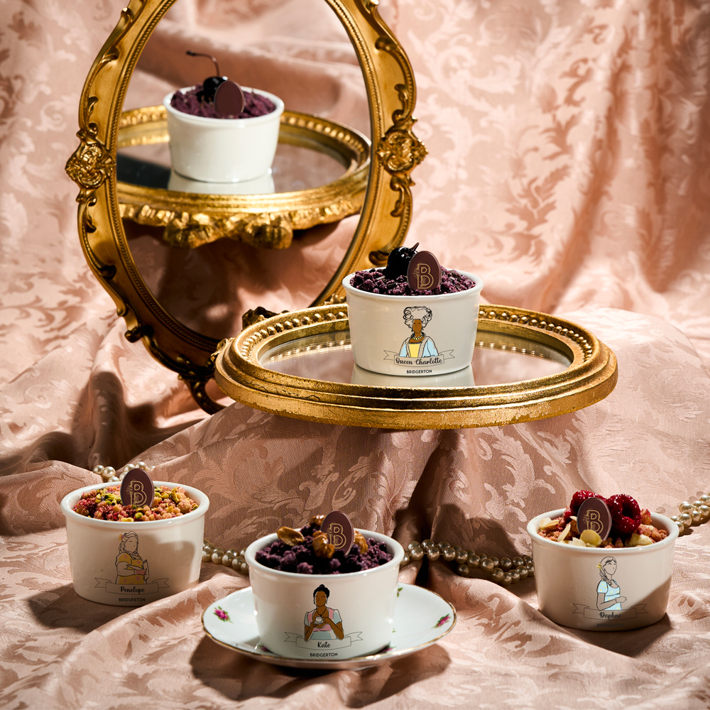 In addition to the range of ice creams, the collaboration also includes a new menu of luxury pastries in which the Queen Charlotte, Daphne, Kate and Penelope Bridgerton crumble dazzles. Similarly, the ice cream parlour wanted to pay tribute to the Bridgerton phenomenon through the interior design and decoration of the La Romana premises in Madrid; evoking London mansions with representative elements such as velvet or details such as bows and brocades that enhance the visitor’s opulent experience.