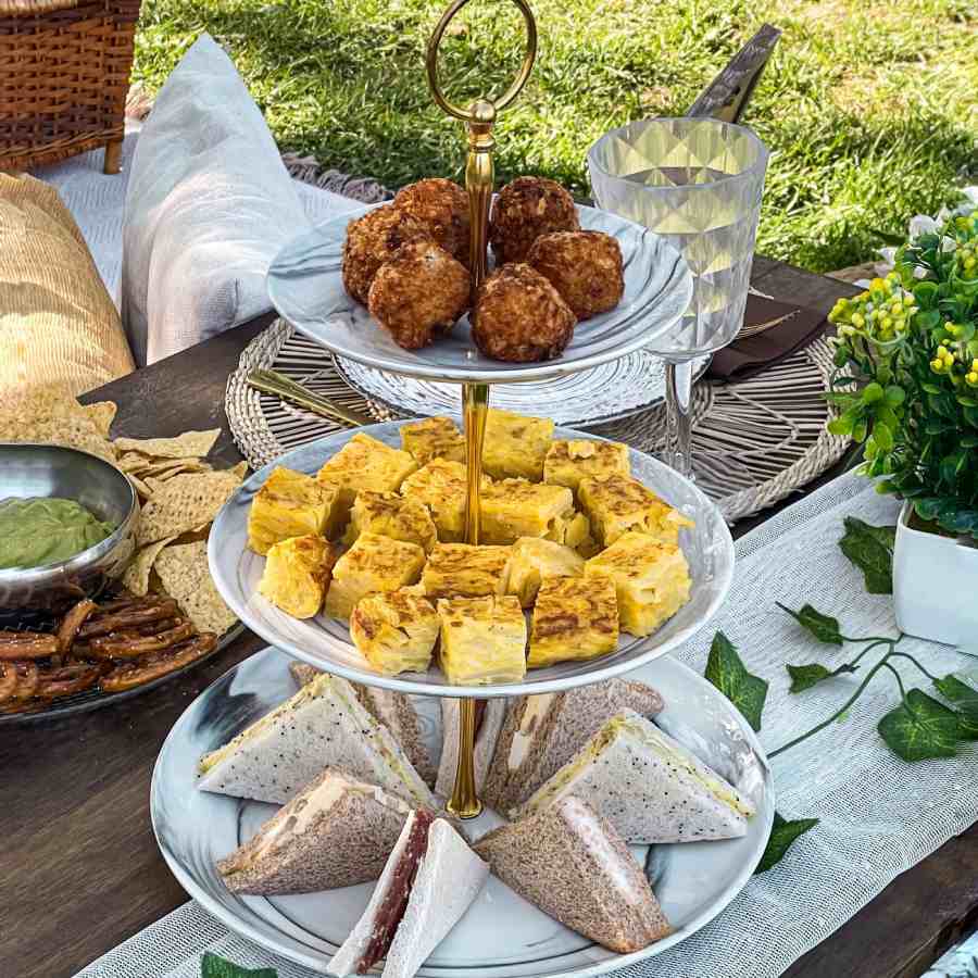 A Spanish-style snackAnd what about the potato omelets (diced), a large Galician empanada, a portion of croquettes, different potato dishes and other snacks. Of course, ham and cheese boards, half moons and other snacks, plus toasts with different ingredients, Russian salad or stuffed eggs. The possibilities for a Spanish style snack are quite wide.