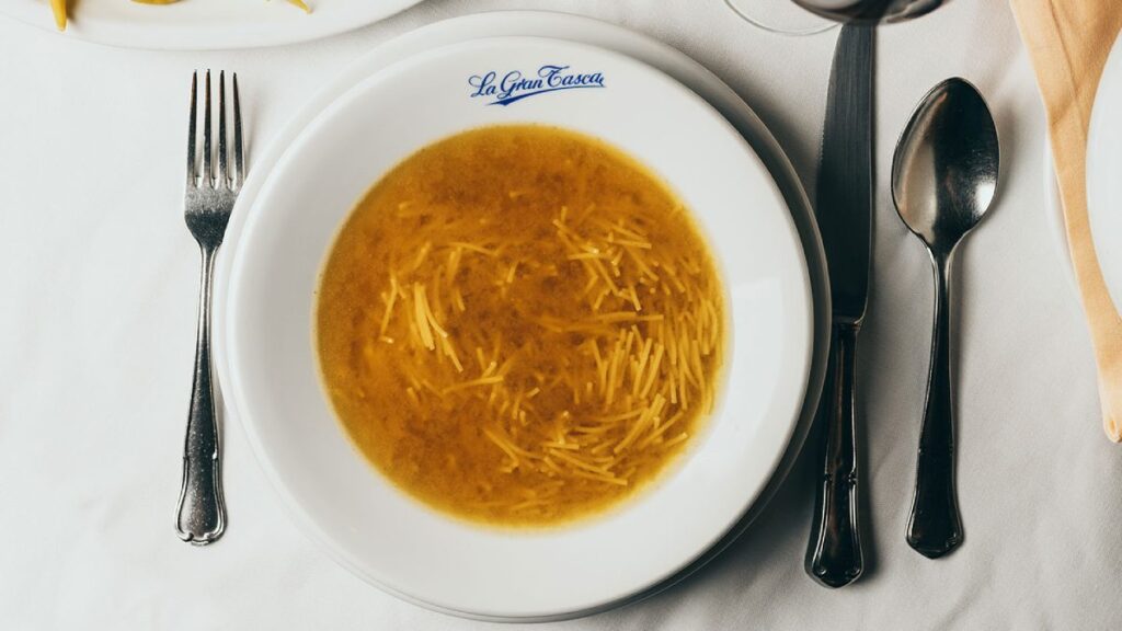 A la hora de servirlo, en La Gran Tasca lo hacen en dos vuelcos. El primero es la sopera de fideos acompañada de guindillas y cebolleta. Así, dejan la sopera en el centro de la mesa para que cada comensal pueda repetir si lo desea. En el segundo vuelco la protagonista es su famosa bandeja con el resto de ingredientes para acabar este homenaje a la gastronomía madrileña como toca.