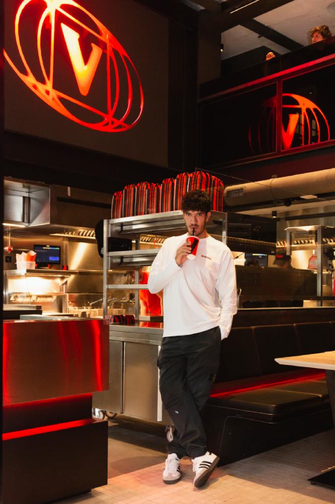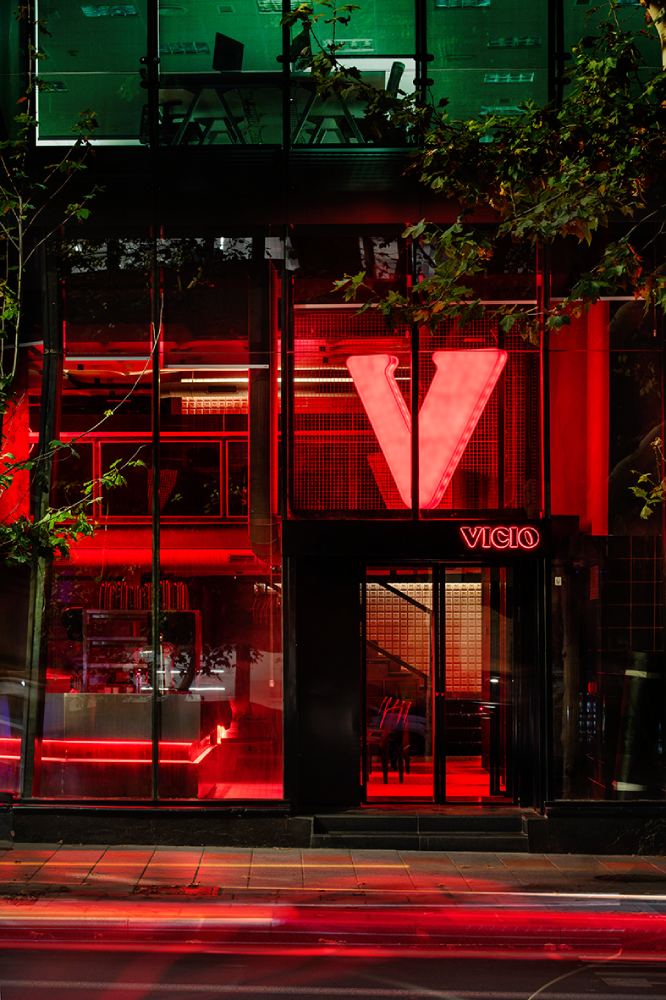Inspirado en clubs neoyorquinos como Studio 54, este nuevo local de Vicio cuenta con dos plantas y la cocina tiene un gran protagonismo. Todos los detalles están cuidados a la perfección con la seña de su potente marca. Desde la reinterpretación de los clásicos ladrillos en las paredes con la inconfundible V, hasta unas zapatillas customizadas por un fan que se las regaló y captó totalmente el espíritu Vicio. Sin olvidarnos tampoco de una sutil reminiscencia a Alfred Hitchcock, recreando una ciudad donde los clientes se sumergen en una atmósfera que evoca un contexto urbano imaginario.