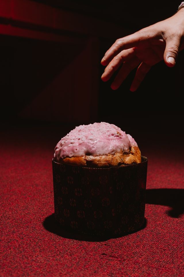 El resultado equilibrado y esponjoso del dulce se logra tras una larga fermentación durante tres días y en frío. Una vez calibrada la masa, se añaden las cerezas recogidas durante el verano cerca de Miranda del Ebro, ciudad en la que el chef dirige un restaurante homónimo, para conservarlas para esta ocasión especial. El chocolate rubí rosa acaba de colorear y darle sabor al panettone.