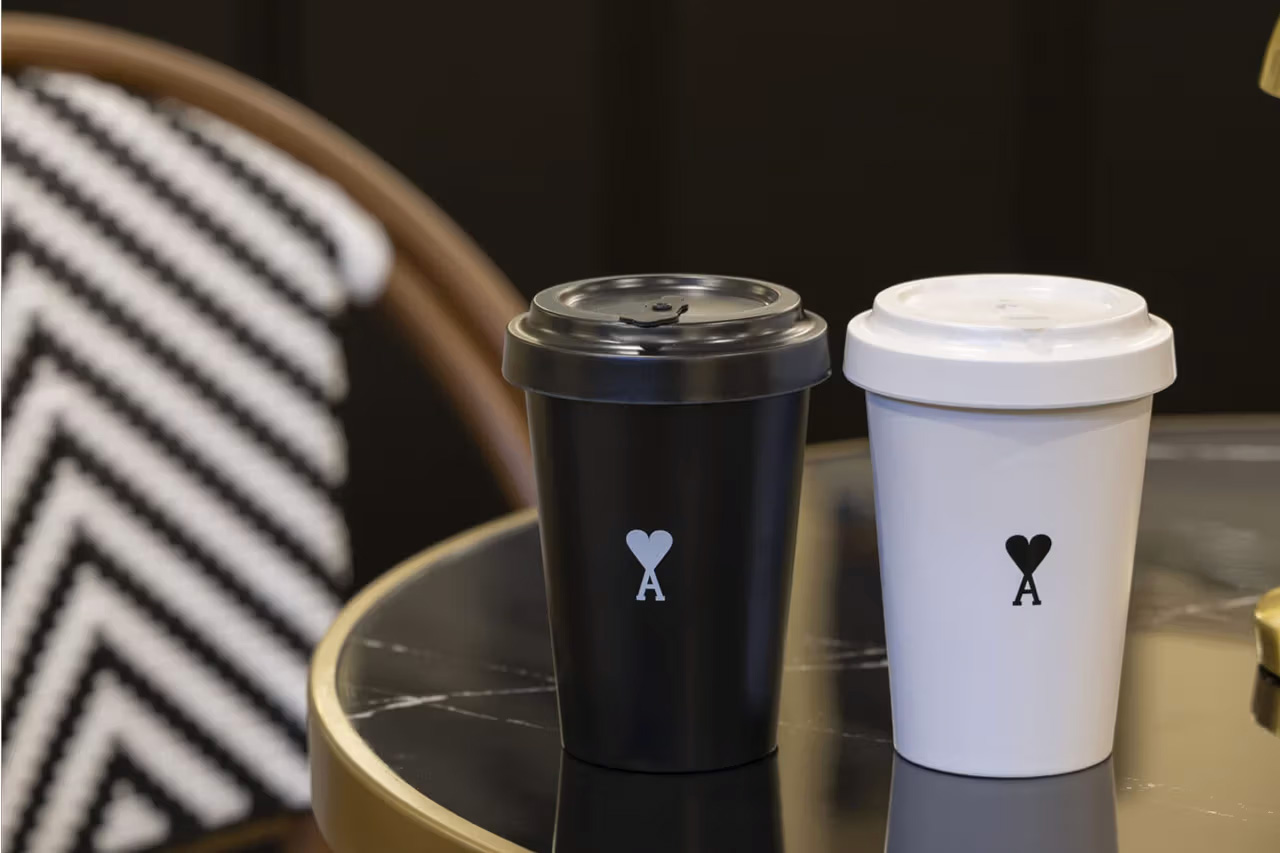 Ami también ha colaborado con cafés locales de Shanghái y Chengdu para trasladar en ellos su visión, enfundándolos de sus suntuosos códigos identitarios. En Shangai, la marca se une a la cafetería Sunset +a:b para transformar su ambiente acogedor en una atmósfera al estilo Ami, con sombrillas a rayas blancas y negras y productos exclusivos de papelería.