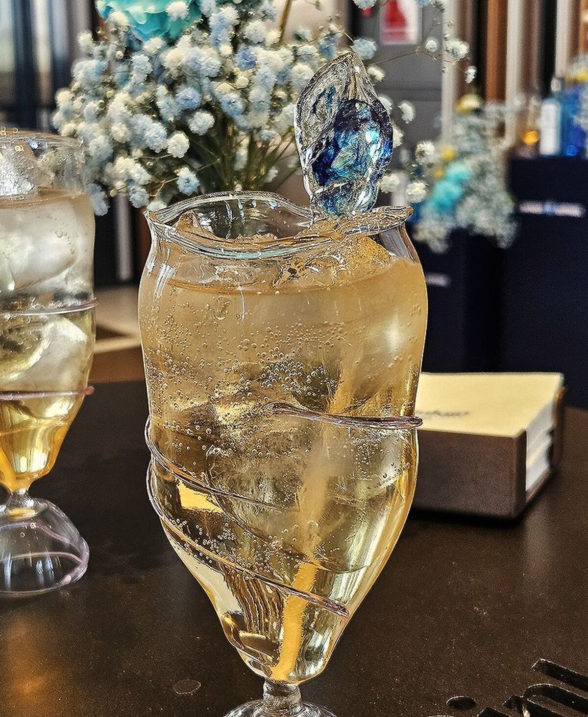 El cóctel Glassy se compone de 5 centilitros de Bombay Sapphire con una cantidad equilibrada de cítrico y salino (90% cordial de lima, 9% agua de mar, 1% de zumo de lima kaffir). A continuación, se mezcla la ginebra con mucho hielo en el vaso mezclador. El resultado se vierte entonces en la copa con hielo y se añaden 2 centilitros de tónica. El toque final llega con un piruleta transparente que decora el cóctel en forma de caracola de mar.