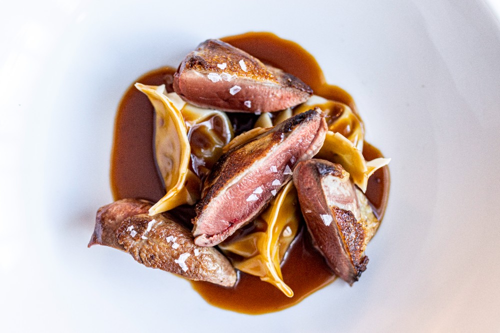 Pichón asado con gyozas y portobelo oloroso. Treze.