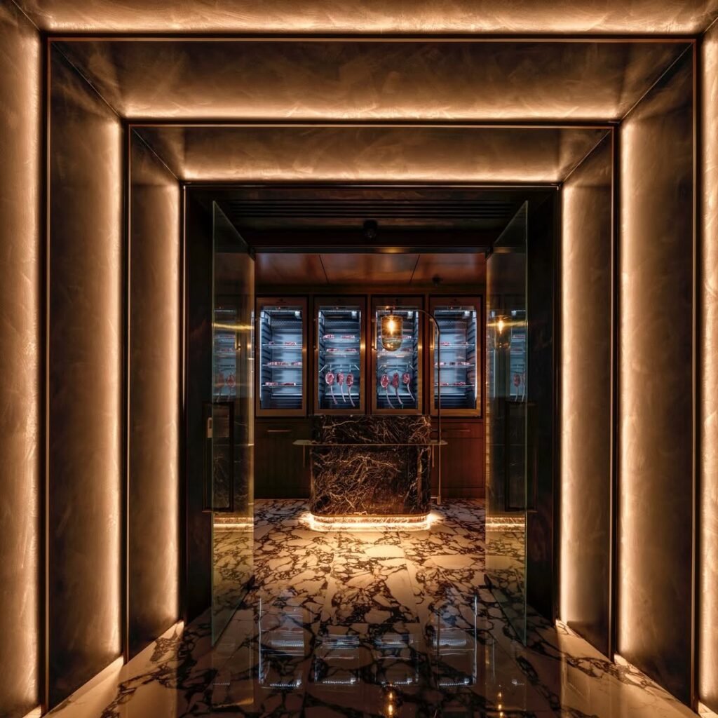 El restaurante ha sido creado por Tosh Berman y Mikey Tanha junto al grupo hotelero Noble 33, el cual nos ha ofrecido un adelanto del espacio y de algunos de los platos que formarán parte del menú. En él, la entrada luce colosal con un túnel que emula la entrada a un gran estadio. Una vez dentro, se distribuyen vitrinas que exhiben diferentes cortes de carne madurados, el producto central de la carta.
