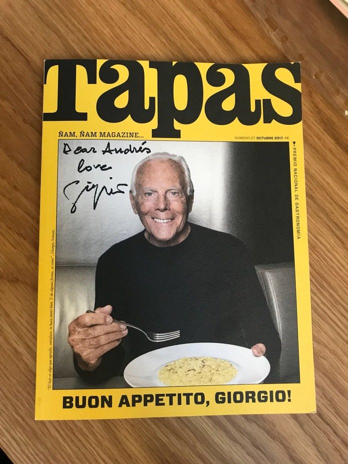 A través de una carta con remite desde Milán el prestigioso diseñador, Giorgo Armani, ha mostrado su agradecimiento a Andrés Rodríguez en unas sencillas líneas que traducidas al español dicen: “Querido Andrés, muchas gracias por la maravillosa portada y el artículo en Tapas. Atentamente, Giorgio Armani”.