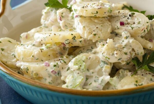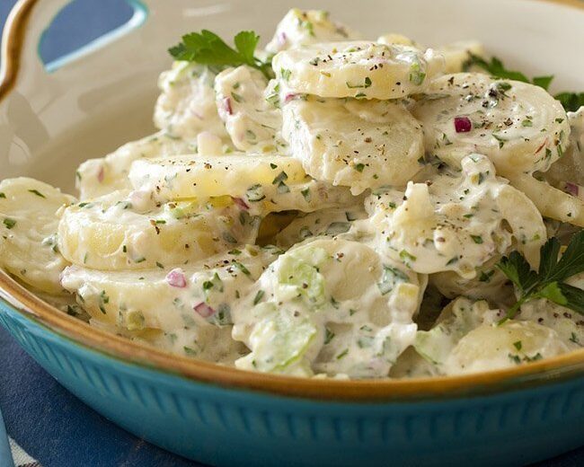 Ensalada de patatas al vapor con mayonesa, ajo, cebolla y cilantro