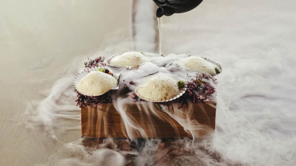 La propuesta gastronómica de Eneko Atxa es informal y actual, pero a la vez está basada en recetas tradicionales vascas. Aquí la parrilla es una pieza clave, con las carnes, pescados y verduras cocinadas en ell. Pero como sorpresa, hasta uno de los postres se termina en las brasas: es la torrija versionada por Atxa, se termina en las brasas.