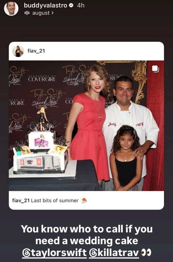 Siguiendo su carrera en el mundo de las celebrities, Valastro ha querido continuar endulzando las bodas del stardom, y, sin perder el tiempo, se ha ofrecido para crear la tarta nupcial de Taylor Swift y Travis Kelce, que se espera que tenga lugar el verano que viene en Rhode Island. «Ya sabéis a quién llamar si necesitáis una tarta de boda @taylorswift @killatrav 👀», escribió el pastelero en stories, junto con una foto de él, Taylor Swift y su hija, Sofía.