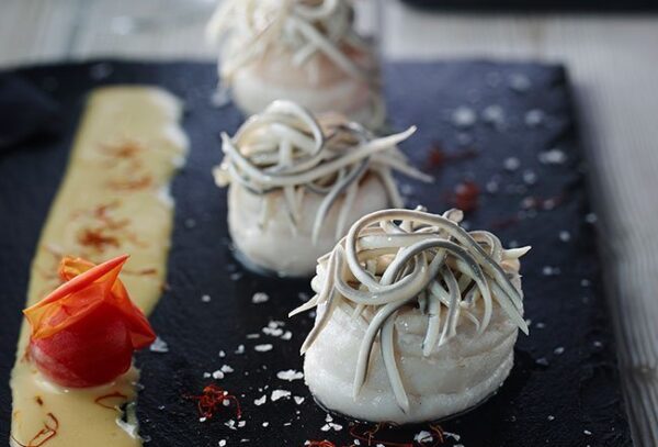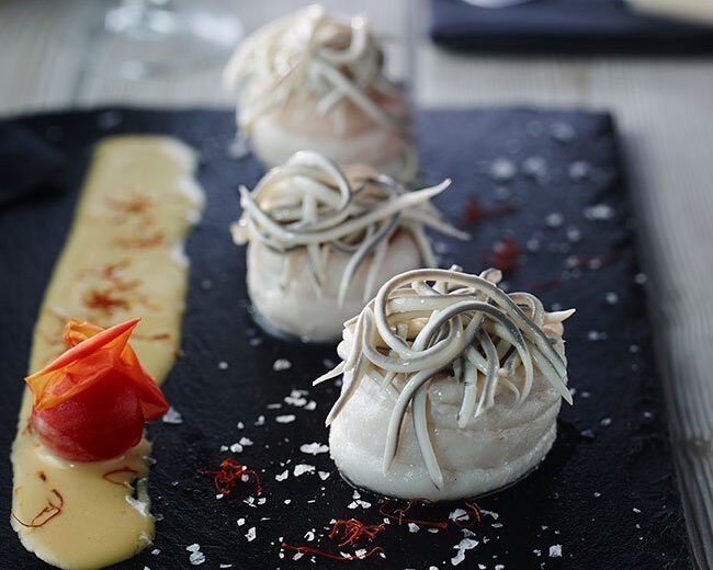 Lenguados rellenos de Gulas® con salsa de azafrán y txakoli