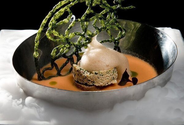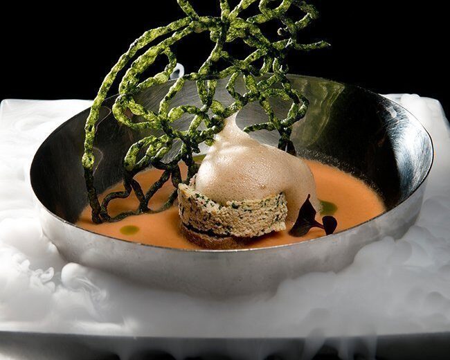 Gazpacho de miso y loto con hamburguesa de tofu, seitán y langostinos y rejilla de algas por Jimena Espiga