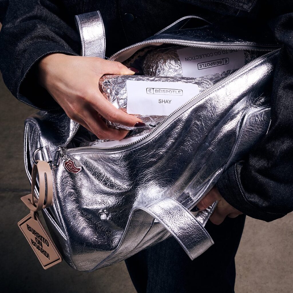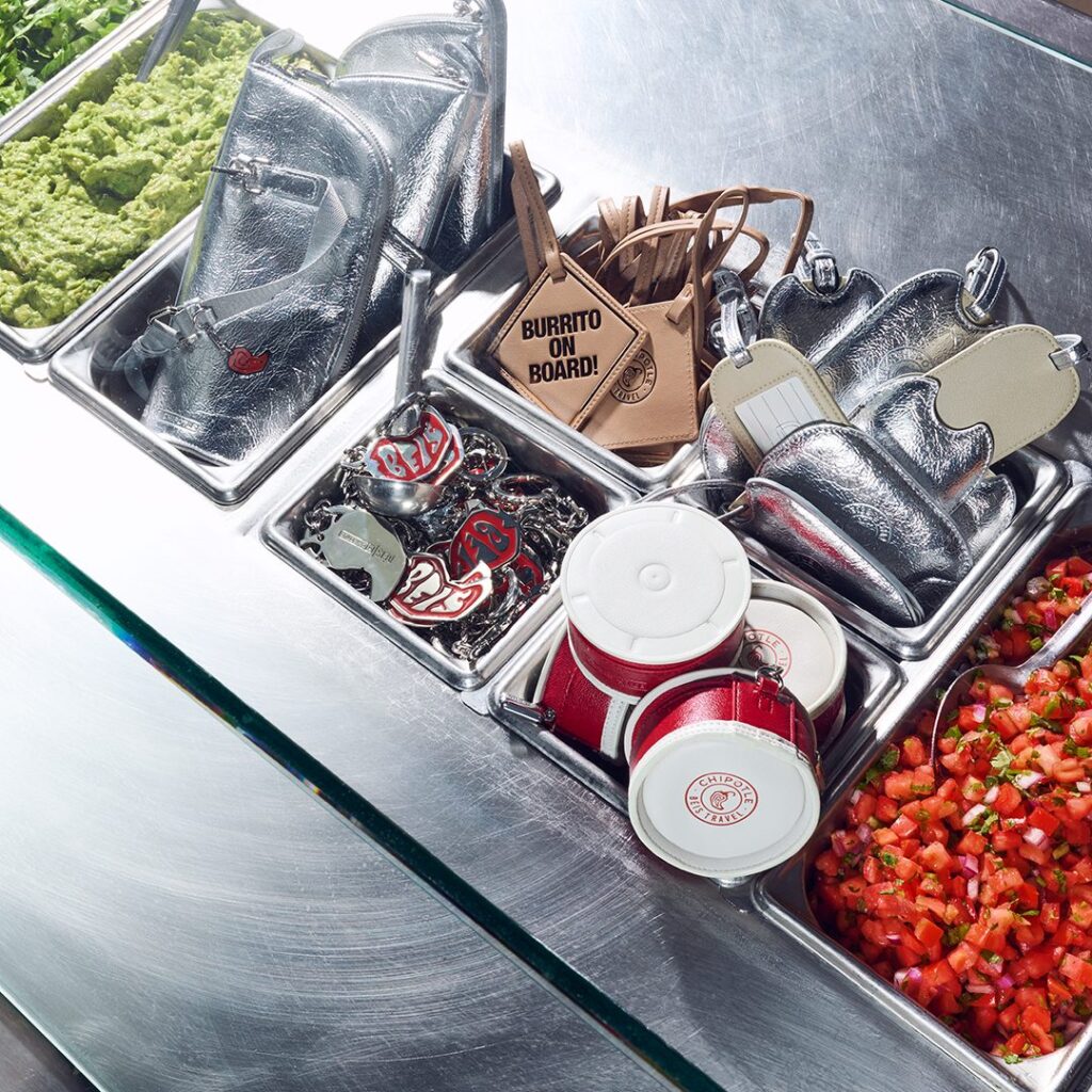 La colección abarca todo el espectro: desde accesorios plateados «recubiertos en papel de albal», fundas para equipaje en el marrón de las bolsas de Chipotle, hasta una bandolera para burritos diseñada para transportarlos allá donde quieras. Éste último cuenta además con un aislamiento para mantenerlo caliente, junto a una bandolera para servilletas de la marca, decorados con charms en distintos tamaños.