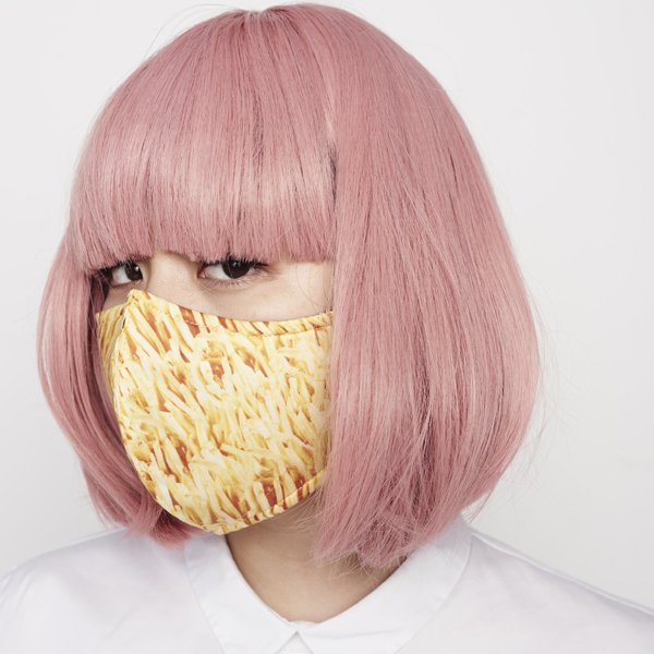 Aunque el vestido de carne de Lady Gaga es a lo mejor pasarse un poco de la raya sí que hay opciones para vestirse de comida en el día a día… si vives en Japoón claro. Tal es el caso de Fomofuku , una marca de moda especializada en mascarillas – como las usadas para la alergia o prevenir la contaminación, muy extendidas en países asiáticos como por ejemplo Japón – de edición limitada que no solo ofrecen funcionalidad sino también moda, arte y diversión. Por unos 25$ es posible elegir entre algunos de sus modelos gastronómicos. Destacan el de hamburguesas, con un fondo negro y deliciosas hamburguesas estampadas; el de coloridas piñas moradas sobre un fondo azul cyan; y el full print de patatas fritas – ¡nuestro favorito!
