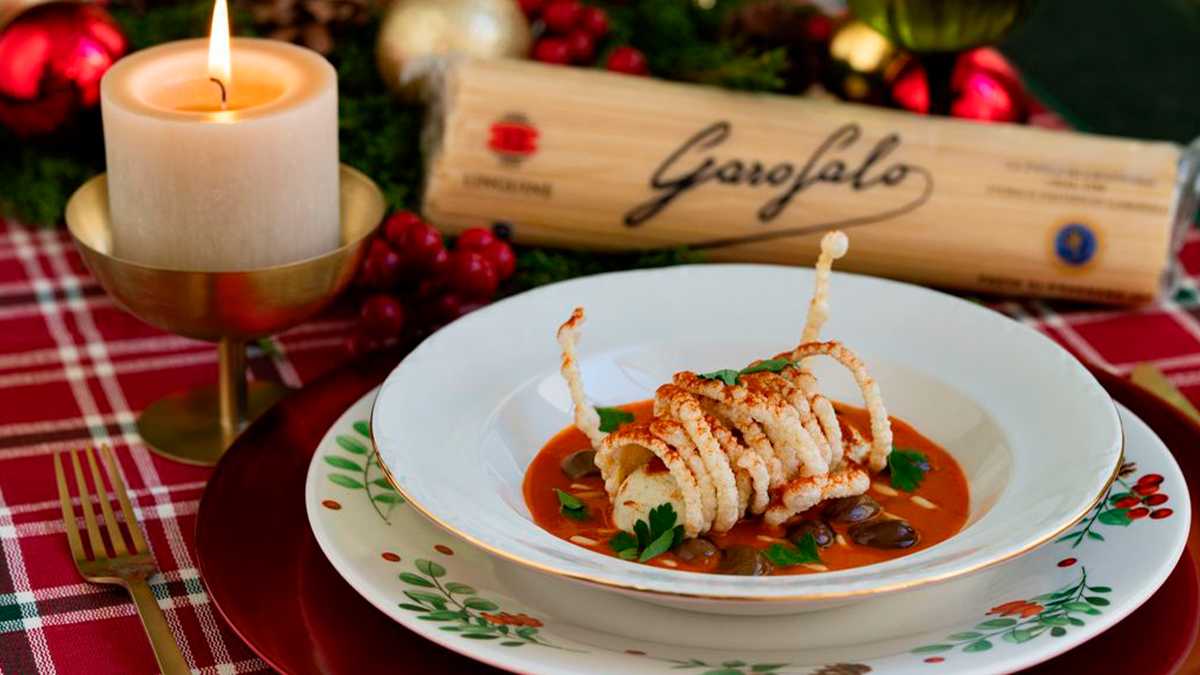 Gianni Pinto, chef del restaurante Noi, propone una de las recetas más sorprendentes de “Sobras di Natale”: un Cannolo de linguine Garofalo relleno de bacalao, elaborado con el bacalao frito que suele preparar en su casa la noche de Nochebuena. Este innovador plato consiste en hacer una mousse con bacalao, ajo, perejil y aceite de oliva, que luego se utiliza como relleno de los linguine Garofalo, que se secan y fríen para lograr una textura crujiente. Todo ello se sirve sobre una base de salsa de tomate, resultando en un plato visualmente atractivo y muy sabroso.