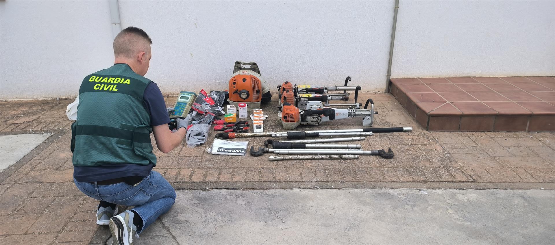 En su interior se localizó numerosa maquinaria agrícola, entre la que se encontraban varios vibros, sopladoras, bombas de agua, hidrolimpiadoras y numerosas herramientas, así como gran cantidad de sacos llenos de legumbres cuyo pesaje asciende a 2.000 kilos, siendo todo ello intervenido tras comprobarse que provenían de los robos investigados. Una vez recuperado el material, valorado en un total de 10.000 euros, fue entregado a sus legítimos propietarios.