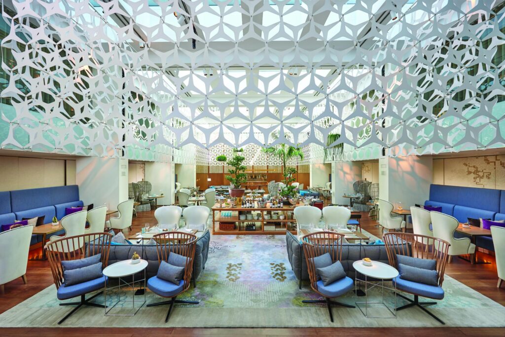 Blanc, situado bajo la luminosa cúpula del hotel, funciona como un refugio cotidiano que propone una cocina honesta -extendida del desayuno a la cena-, orquestada en torno al producto real, de proximidad y de temporada. Al mediodía, su chef ejecutivo Jordi Delfa afila los cuchillos para reinterpretar la cocina catalana sin artificios, bajo una técnica precisa y refinada.