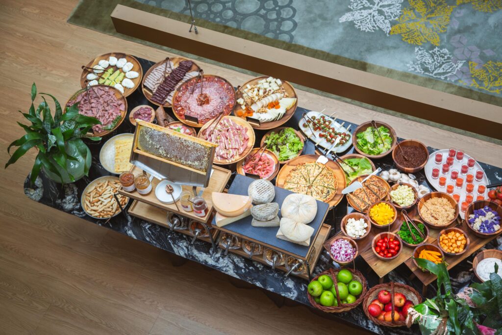 Los domingos, el brunch se profesa como una religión en el restaurante. Un ritual mediterráneo que despliega un gran banquete de ibéricos, mermeladas artesanas, y un surtido de postres deliciosos que dialogan con la estacionalidad.