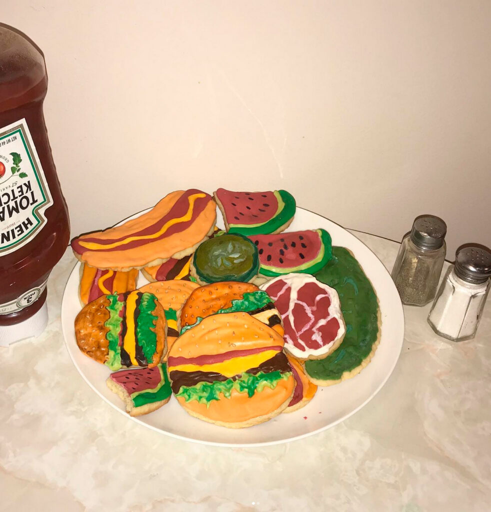 Más allá de esas piezas de diseño, Jacqui presenta en su expositor otros juegos culinarios en la que vislumbra sus extensas habilidades en el mundo de la ilustración ‘con crema de mantequilla y virutas de colores’. En su mayoría, tartas o cookies de retratos de personalidades random que cumplen años, junto a pasteles de fantasía que toman como referencia la naturaleza, la gastronomía o la moda. En este sentido, la neoyorquina ha esculpido objetos de deseo que van desde unos tacones de MIU MIU hasta un bolso de Balenciaga en forma de corazón gótico.