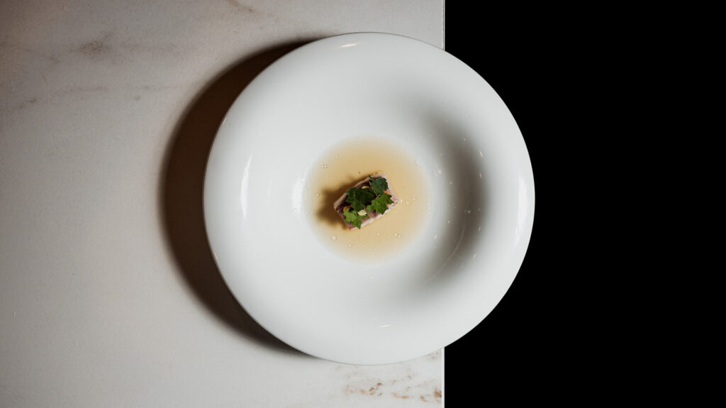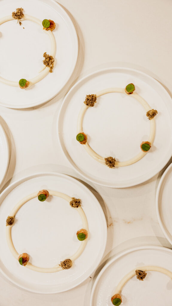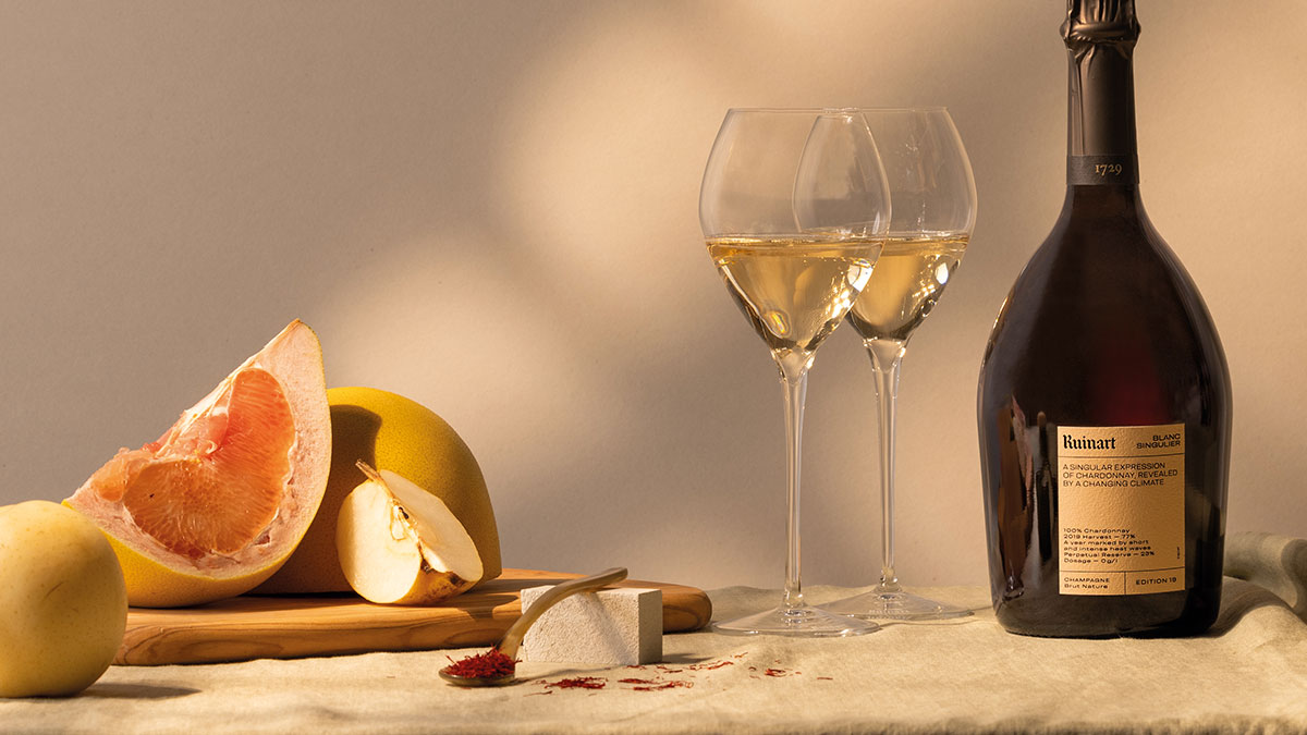 Gallegos, conocido como “el chef del caviar”, ha desarrollado una propuesta gastronómica única, centrada en especies de río y productos de cultivo propio. Su enfoque, que pone la sostenibilidad en el centro del discurso culinario, encuentra un eco perfecto en Blanc Singulier Édition 19, la nueva cuvée de Ruinart concebida como respuesta directa a los efectos del cambio climático sobre el viñedo. Un champagne 100% chardonnay, sin dosaje (brut nature), con tres años de crianza y elaborado a partir de la excepcional vendimia de 2019, marcada por temperaturas inusualmente elevadas en la región de Champagne.