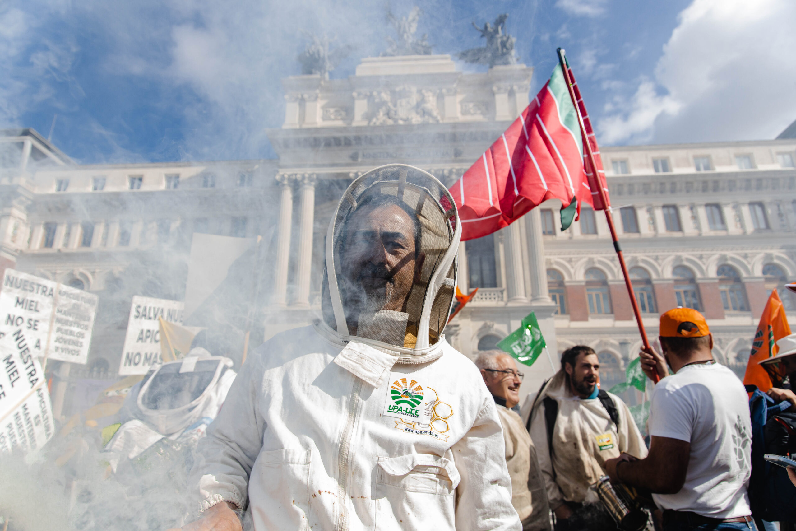En un ambiente «combativo y reivindicativo», según ha informado UPA, los productores de miel han llenado el ambiente con el humo de sus ahumadores -que se utilizan para manejar las colmenas-, del ruido de sus tambores, de baños de miel ante el Ministerio de Agricultura y de los gritos de sus demandas, que persiguen cambios en la normativa de etiquetado de la miel para que se reconozca y se proteja el origen español de la miel.