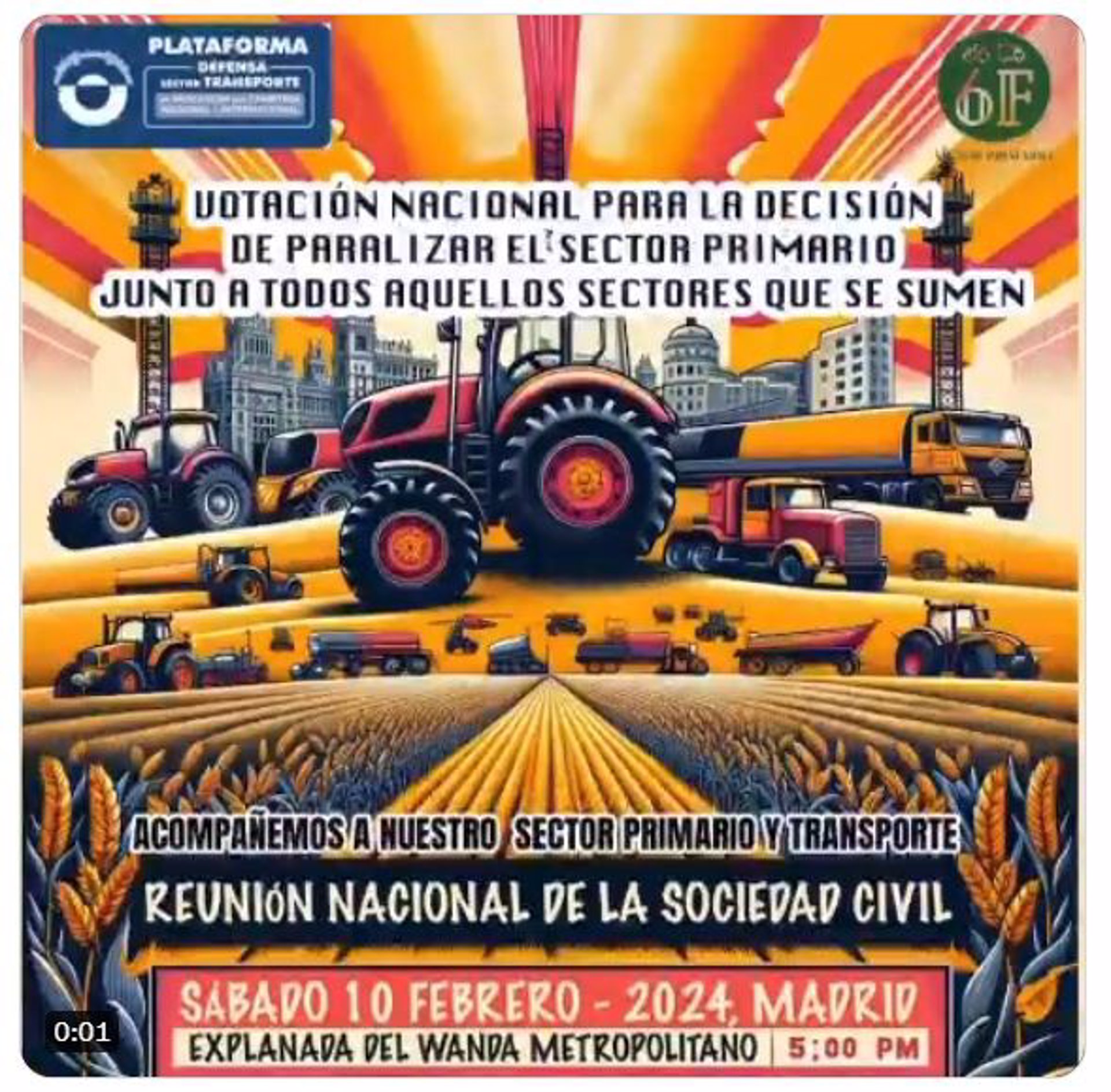 La plataforma 6-F ha llamado a votar este sábado en la explanada del estadio Metropolitado en Madrid si paralizan las manifestaciones y concentraciones de agricultores y ganaderos o continúan con una huelga masiva.