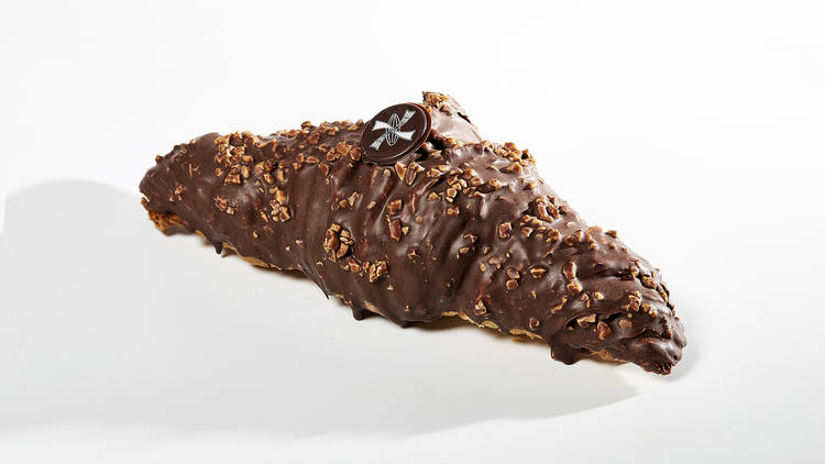 Si lo prefieres relleno, siempre puedes optar por su croissant gianduja, que sigue el mismo proceso de elaboración pero con un interior de praliné gianduja de VALRHONA, a base de cacao, avellana y leche.