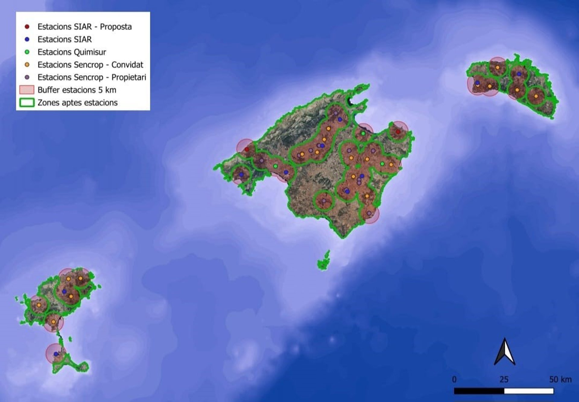 Actualmente, las 16 estaciones que forman parte de la red del Govern (Sencrop) cubren de manera efectiva un radio de cinco kilómetros en torno al lugar en el que están ubicadas. Además, estas se complementan con las estaciones del Sistema de Información Agroclimática para el Regadío (SIAR) del Ministerio de Agricultura, Pesca y Alimentación, así como con instalaciones privadas que comparten los datos de forma gratuita (Quimisur). Las áreas que quedan fuera de este alcance se identifican como prioritarias para futuras instalaciones.
