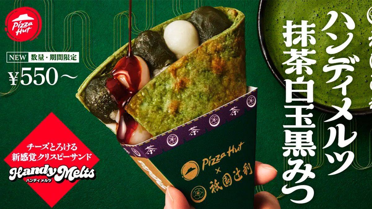 La ‘Handy Melts Matcha Shiratama Kuromitsu’ está elaborada con una masa de pizza bañada en matcha, y cubierta con una pasta de matcha, bolas de arroz shiratama, mozzarella y queso crema. Para darle un toque extra de dulce, se le añade sirope kuromitsu.