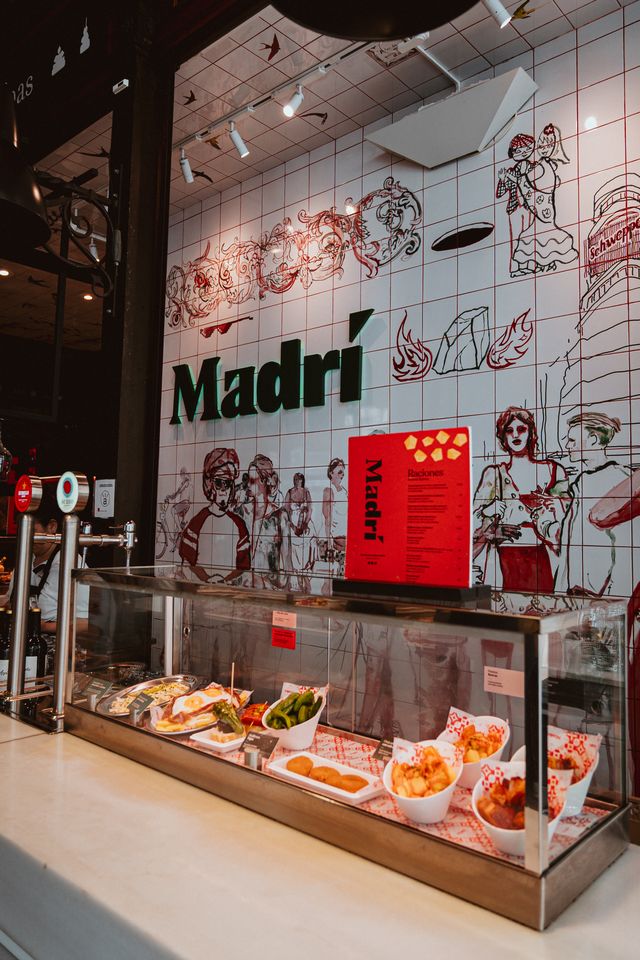 Madrí despunta como la versión más desenfadada del proyecto. Una manera distinta de trabajar el producto castizo con tapas madrileñas emblemáticas como los torreznos, los espárragos fritos o la ensaladilla rusa. La identidad visual del espacio refuerza mientras tanto el espíritu del local con un mural original del artista David Cárdenas que representa la cotidianidad de Madrid a través de farolas, bancos y monumentos sagrados de la ciudad.