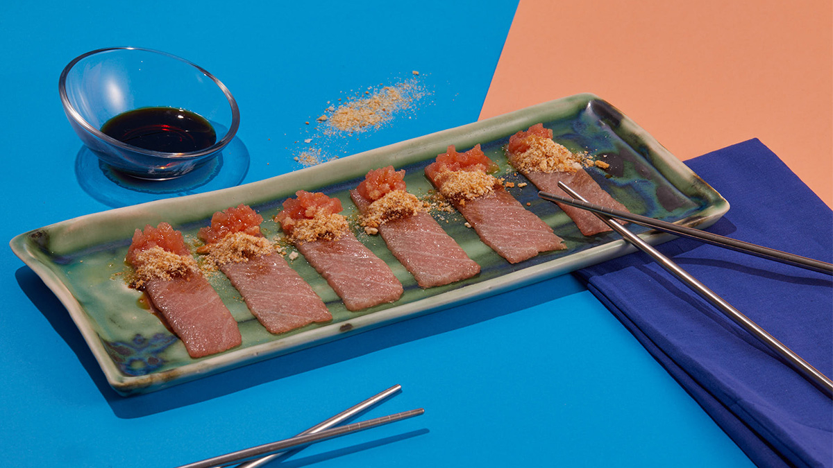 - Colocar en un plato largo las 12 tiras de ventisca de atún, una al lado de la otra.