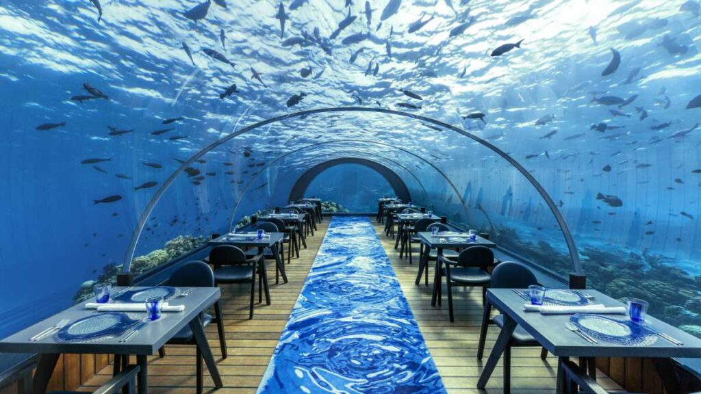 Another one of the undersea restaurants in the Maldives, specifically at the Anantara Kihavah luxury resort. Here you will experience a gourmet meal under the ocean. It has the first undersea wine cellar and its dining room is surrounded by sharks, turtles and tropical fish swimming around while diners experience haute cuisine. Gourmet meals under the ocean waves in an undersea restaurant. They have a 7-course tasting menu for €553, including food and wine pairing. Some of its highlights are dishes such as lobster salad, Scottish salmon, sea bass and its triumphant dessert, the chocolate explosion.