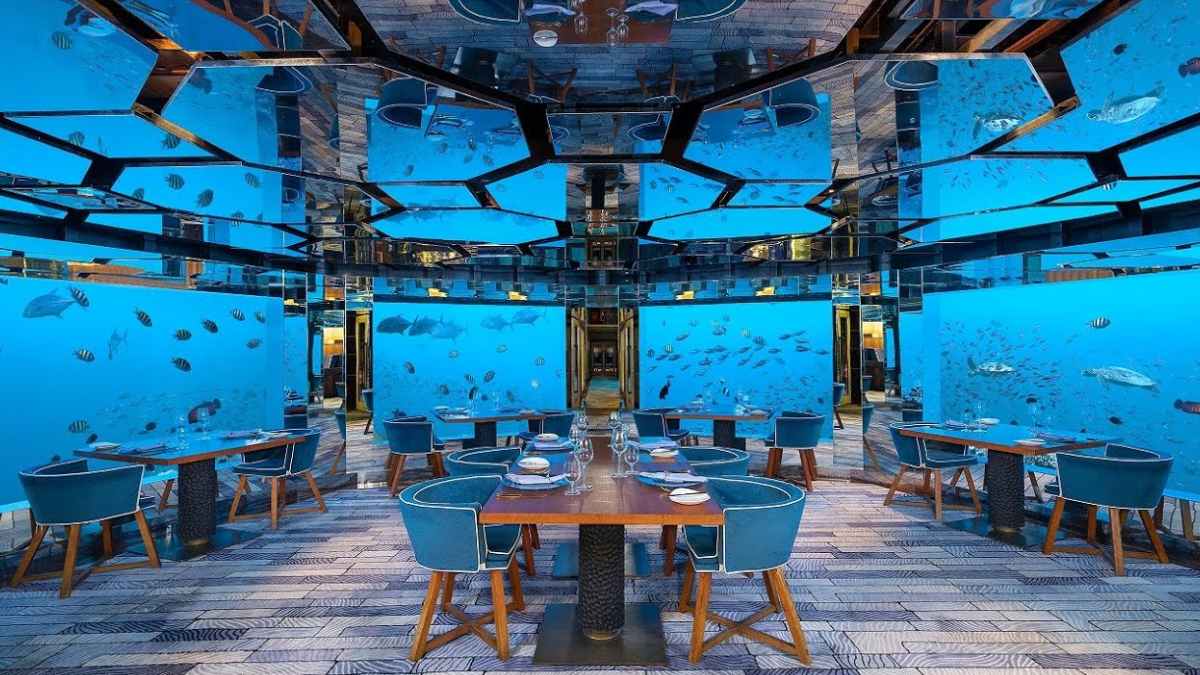 If you are looking for a 100% immersive evening, in this restaurant located in the Hurawalhí resort in the Maldives and considered the largest fully glazed restaurant in the world, you can enjoy a 7-course tasting menu at a depth of 5.8 metres for almost €300. With predominantly seafood dishes, such as tuna tartare with wakame or poached lobster in beurre blanc emulsion. They also have vegan options. And all this with spectacular views, making it one of the most sought-after undersea restaurants.