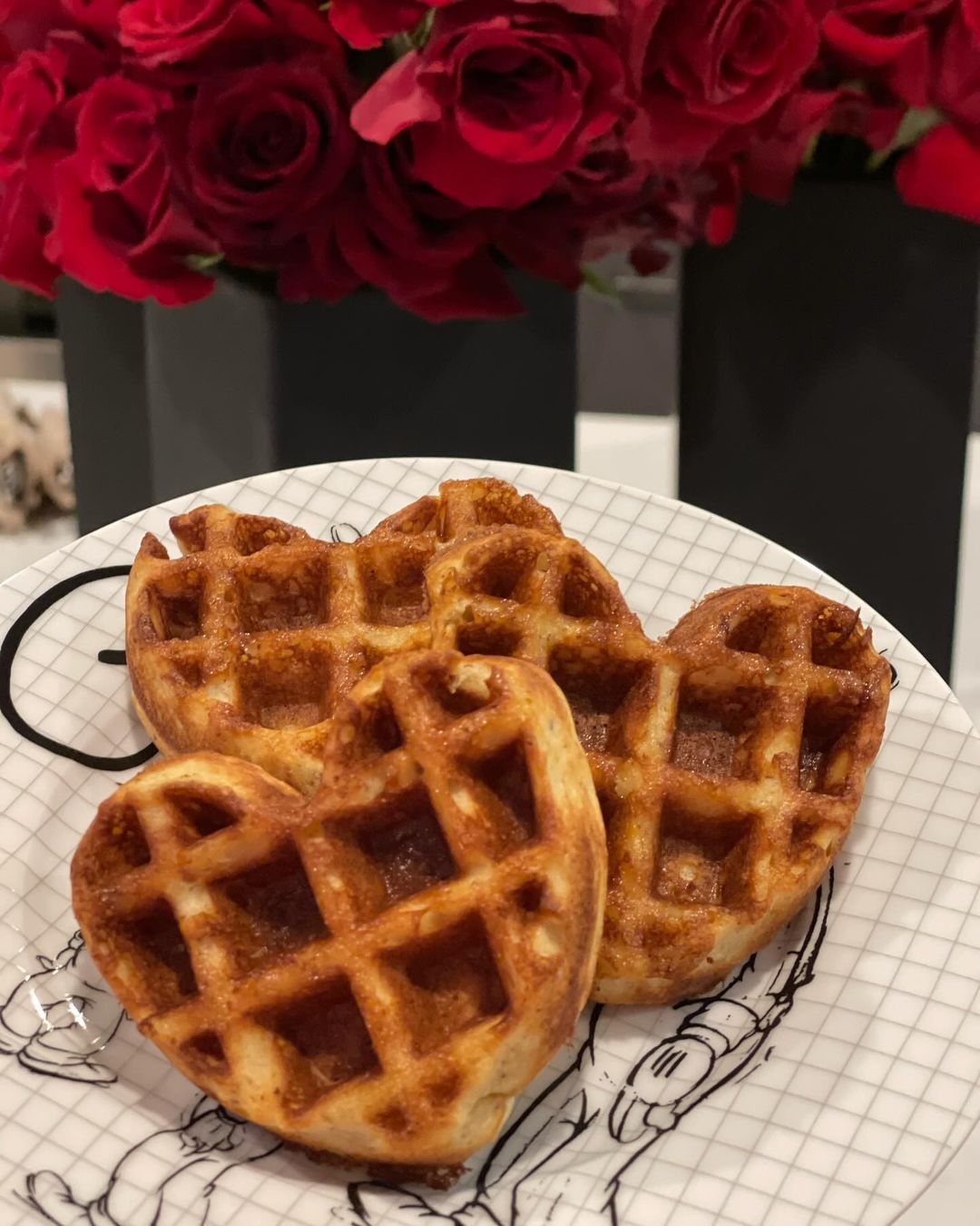 In another shared snapshot, she and Barker are seen enjoying a glass of wine in red bodysuits amidst an idyllic natural setting, while another is a gastronomic one of a still life with heart-shaped waffles.