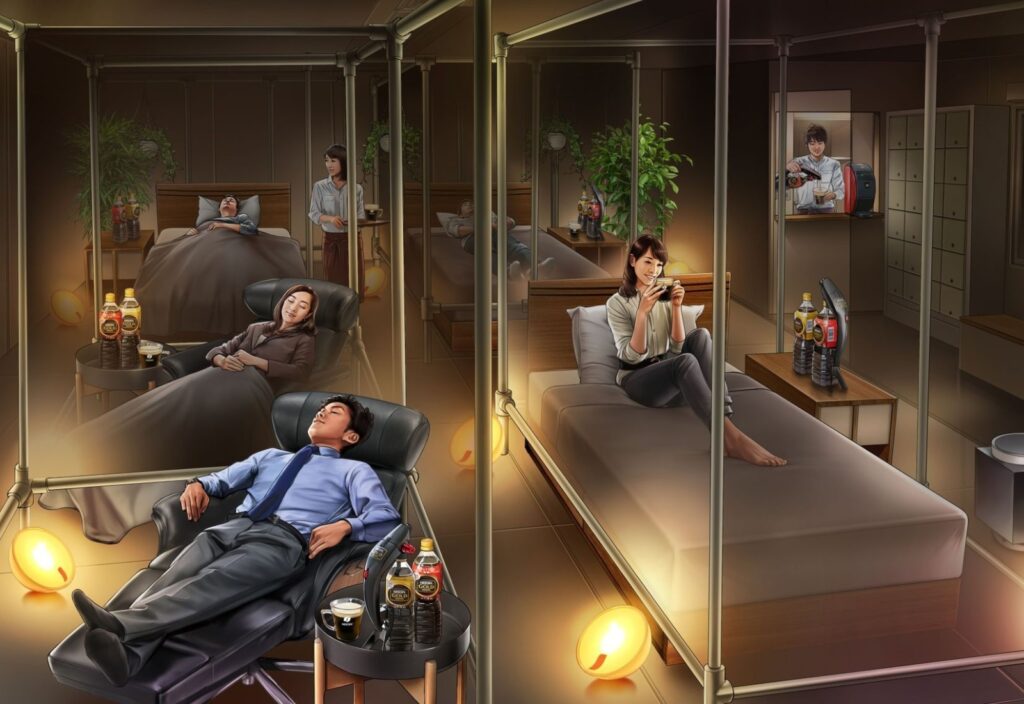 The capsules are available in two styles: the ‘Spacia’, with a sleek, futuristic design, and the ‘Forest’, which features a Japanese wood-framed aesthetic. Both are equipped with dimmable lights, ventilation and power outlets for charging devices while napping.