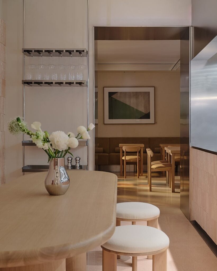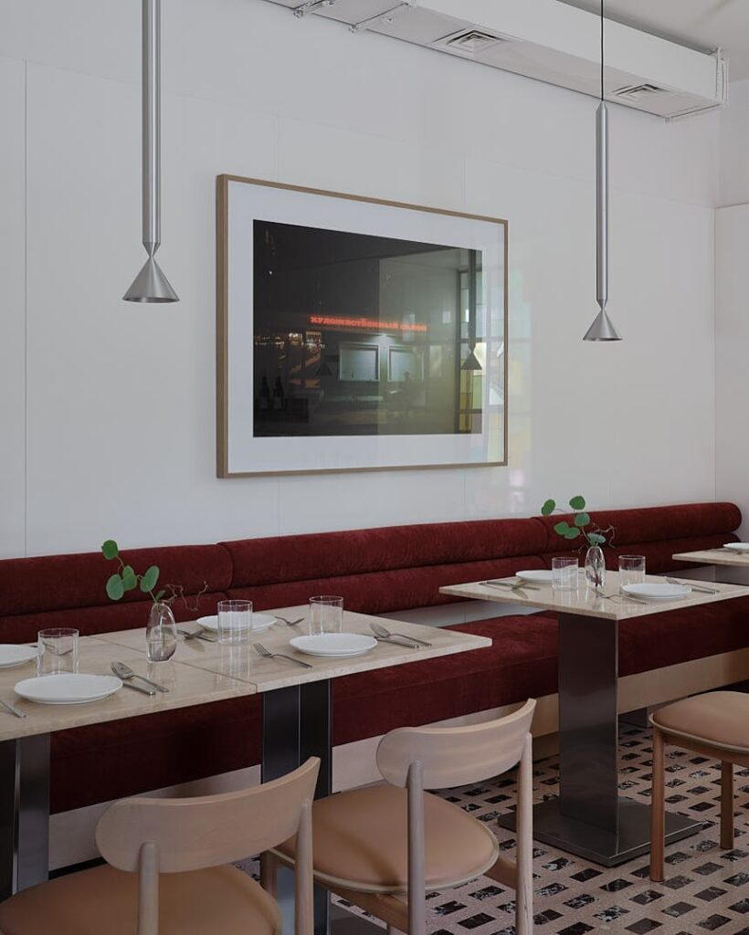 Six Coffee + Wine ha querido rendir tributo con ello a la comunidad artesanal de Almaty a través del mobiliario y las instalaciones artísticas, como las mesas de travertino complementadas con los asientos ergonómicos de Aq Objects, cuyas formas evocan los bancos tradicionales de las yurtas.