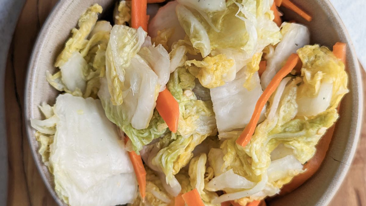 - Lava la col y retira las hojas exteriores. Córtala en cuartos y luego haz trozos pequeños.
