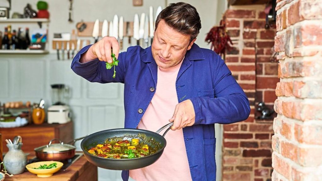 Jamie Oliver fue descubierto por la BBC mientras trabajaba en el restaurante The River Café, lo que lo llevó a protagonizar su primer programa de cocina. Desde entonces, ha construido un imperio gastronómico con más de 70 restaurantes en 24 países, además de publicar numerosos libros de cocina y protagonizar múltiples programas de televisión. A sus 48 años, es uno de los chefs más reconocidos del mundo. En 2015, recibió el título de caballero de manos de la reina Isabel II por su contribución a la industria alimentaria.