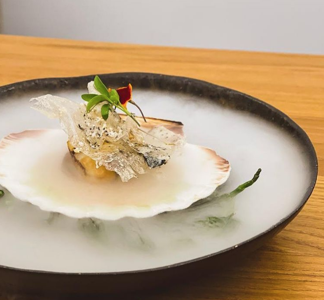 A pesar de que el comedor de Edwyn Rodríguez se inauguró en enero de 2020 y, tras solo dos meses de rodaje, tuvo que cerrar sus puertas (pandemia mediante…) para abrir a medio gas varios meses después, tiene algo de lo que poder presumir: ofrece una cocina única en nuestro país y, quizás, en toda Europa. Por eso es uno de los nuevos estrellas Michelin de este año. Y esta receta, la que nos atañe, recrea «toda la influencia de los sabores del Caribe colombiano»: la vieira, aliñada en aceite de achiote y braseada al momento, se sirve acompañada de un picadillo de mango amarillo y ají y bañada en crema de tamarindo y coco.