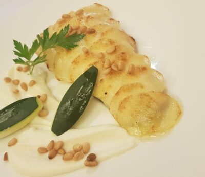 Lubina con escama de patata y crema de apionabo, por Francisco Martínez Sarabia