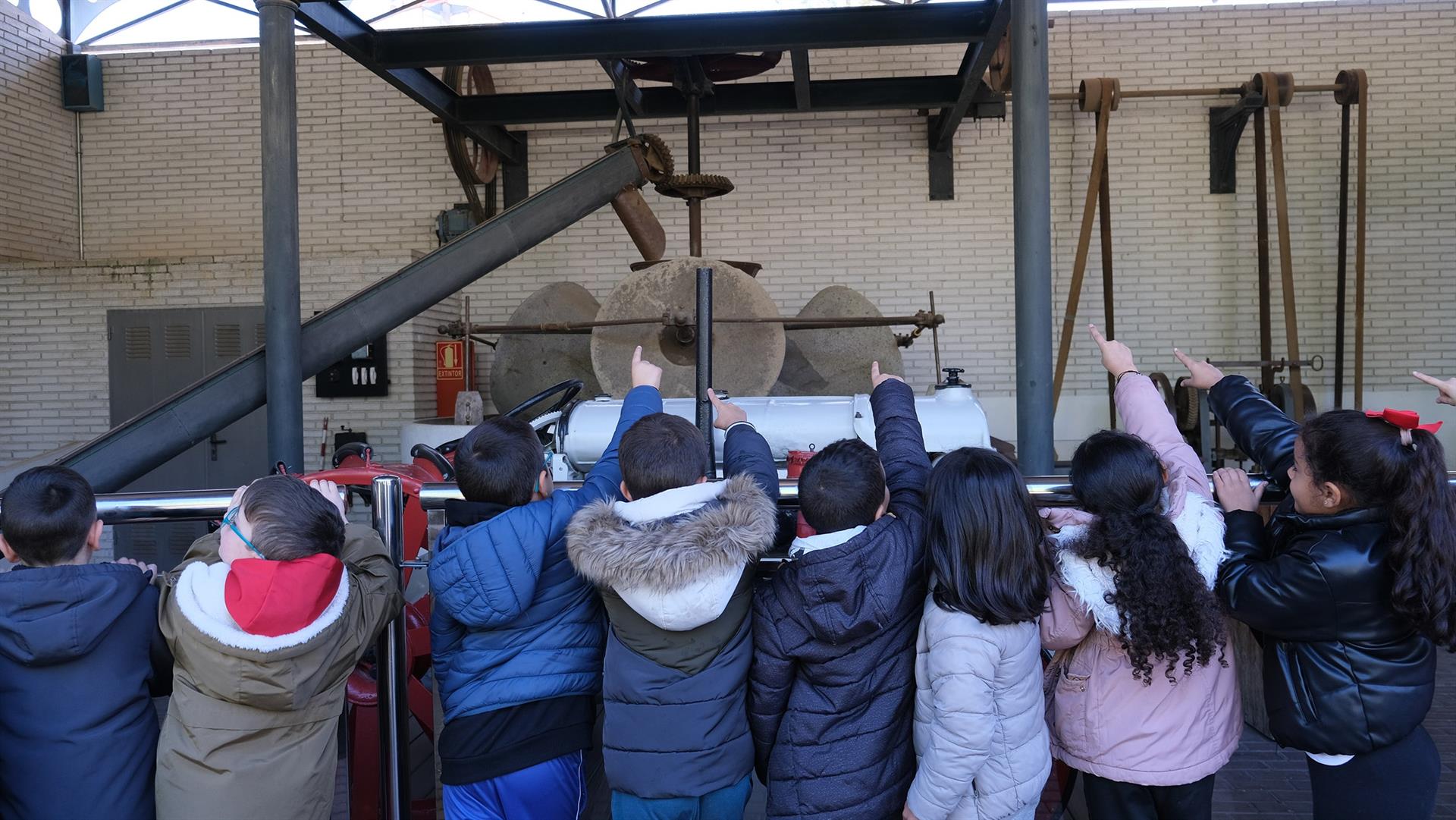 Miembros de la Asociación de Voluntarios Culturales del Parque de las Ciencias han explicado a los escolares las labores necesarias para la obtención del AOVE: el cuidado del olivar, el arte del vareo, los métodos tradicionales de obtención del aceite y los diferentes usos en los que es empleado a la vez que han visto en funcionamiento la almazara.