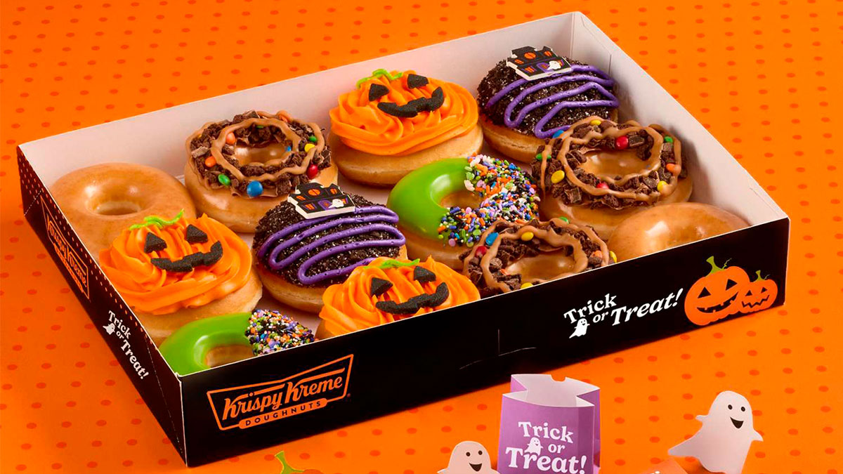 El surtido “Trick or Treat!” presenta una variedad de productos temáticos inspirados en la dulce oscuridad de Halloween. Cuatro delicias con las que morirse en el acto, empezando por el «original glazed» cubierto con crema de mantequilla con sabor a chocolate, que evoca las barras de chocolate que se encuentran en las bolsas de dulces.