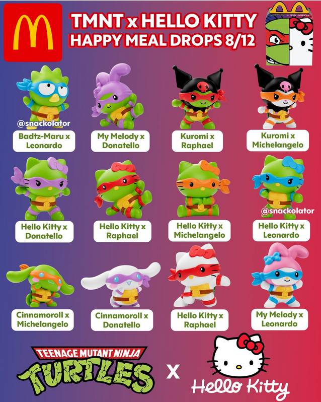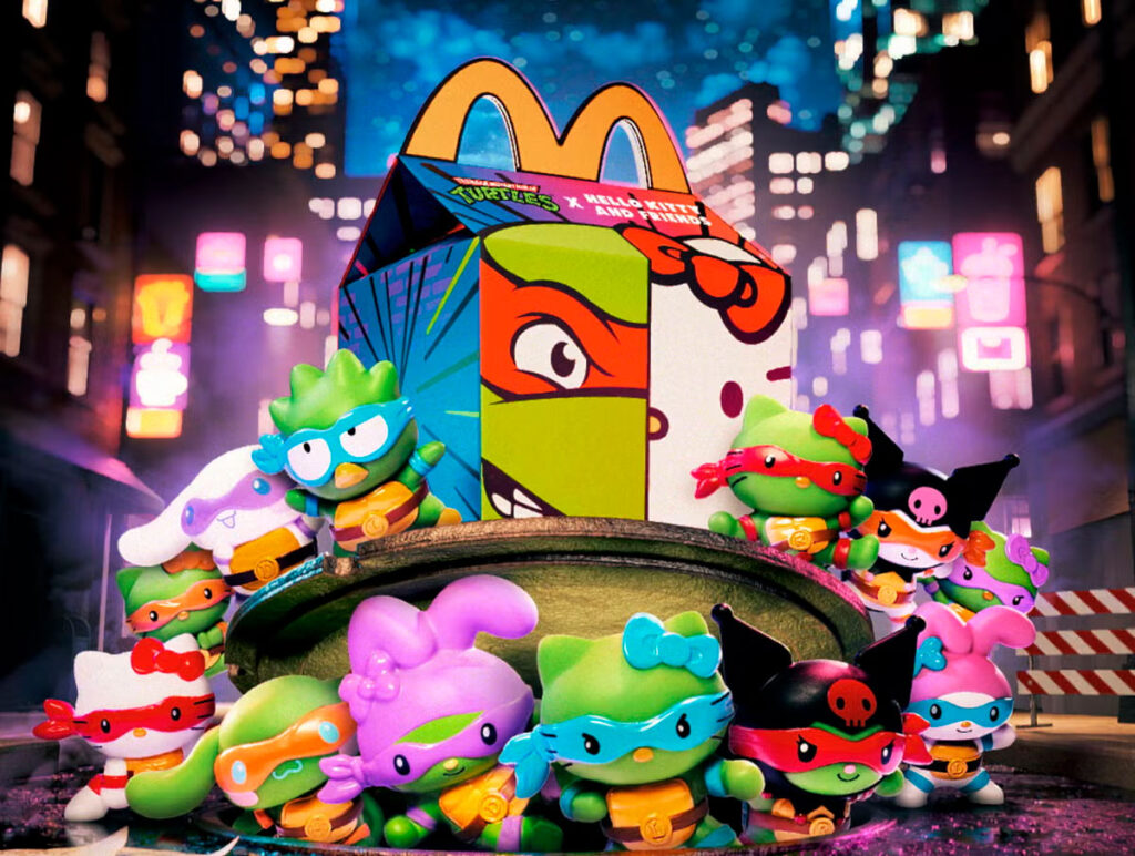 La nueva colaboración nostálgica de la cadena con Hello Kitty y las Tortugas Ninja presenta un menú invadido por 12 figuritas que hibridan sus personajes de fantasía, acompañadas de una tarjeta con el personaje que revela sus habilidades y su historia. «Imagina a Donatello con un toque de Cinnamoroll, o a Kuromi luciendo la actitud feroz de Michelangelo».