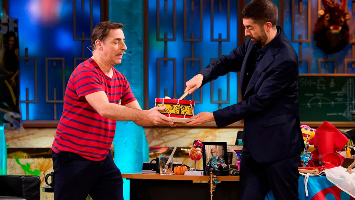 El postrero más famoso del mundo no para de crear y de divertirse dentro de la industria. Anoche, lo haría en ‘La Revuelta‘ con David Broncano, para quien incluso diseñó un postre exclusivo bautizado como ‘postre revuelto‘. La creatividad, el sarcasmo y la originalidad de Jordi Roca se vieron reflejados una vez más en ese postre presentado sobre un bombo que ‘al golpearlo con la baqueta’ se partía a trozos. En su interior, ya deconstruido, el repostero presentó una mezcla de bizcocho de cítricos y frutas como el limón, el yuzu japonés o la bergamota. Todo con una correlación o un significado detrás, como el del ácido de sus ingredientes el cual acaba provocándonos una sonrisa. Por no hablar de su recreación en miniatura del peluche del perro del programa que también incluyó en forma de chocolate.