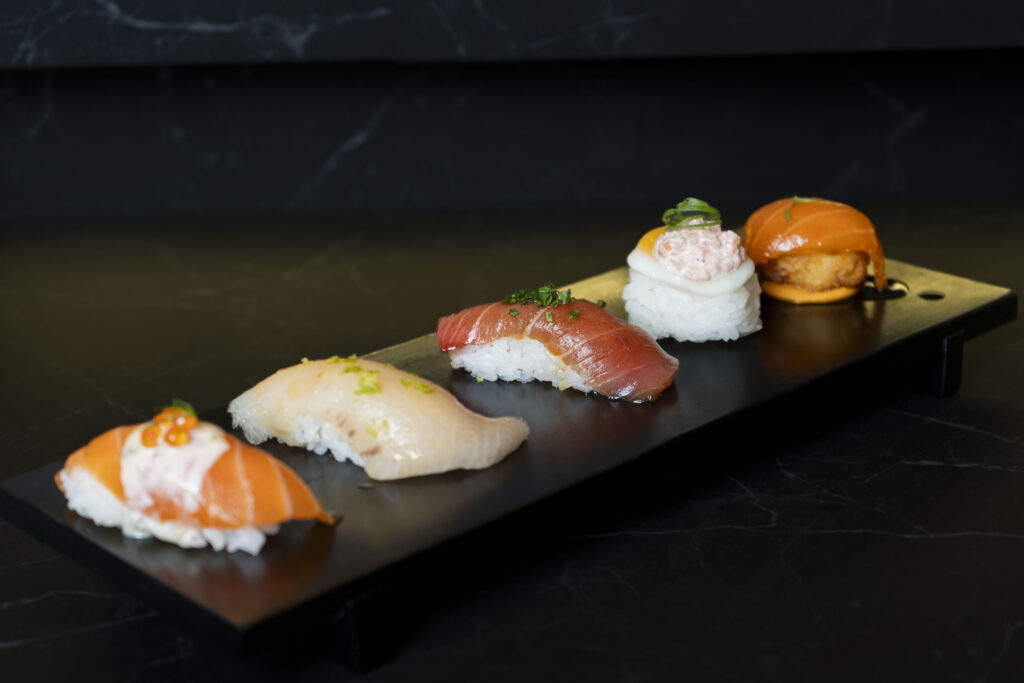 Desde fuera puede parecer una propuesta casual, pero basta acercarse a su mostrador —siempre animado, con el ir y venir constante del mercado alrededor— para entender que aquí hay técnica, fuego y mucha sensibilidad. La cocina, abierta y visible, convierte cada servicio (cocina ininterrumpida mediante) en una pequeña coreografía de cuchillos, brasas y producto. El sushi se trabaja con ese equilibrio exacto entre temperatura, corte y textura que distingue a quienes saben que la simplicidad solo funciona cuando el producto es impecable. Nigiris delicados, handrolls que se comen en dos bocados y yakitoris al carbón conviven con una carta pensada para ir probando, alternando frío y brasa, delicadeza y profundidad.