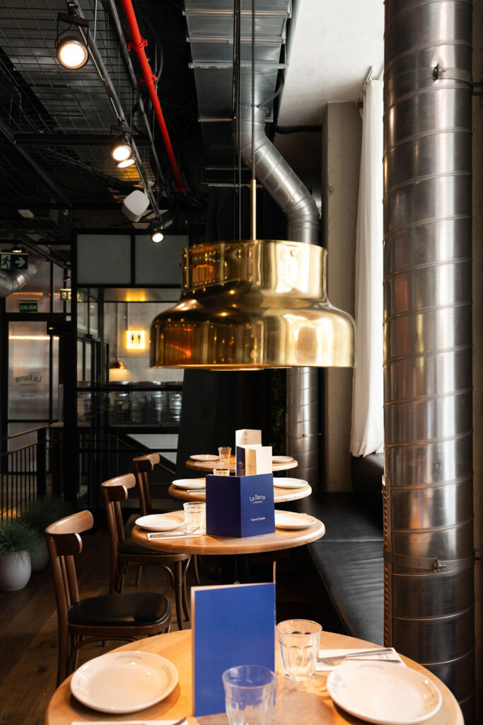 El bar-restaurante se baña de la sensibilidad estética del grupo a través de una reinterpretación contemporánea del clásico bar madrileño en el que ha querido preservarse la estructura original del local, con hormigón visto y esa esencia brutalista con materiales como el granito o el latón. En el centro: una gran barra desde la que se articula todo el concepto en la que poder extender la vida social de la calle a la mesa.