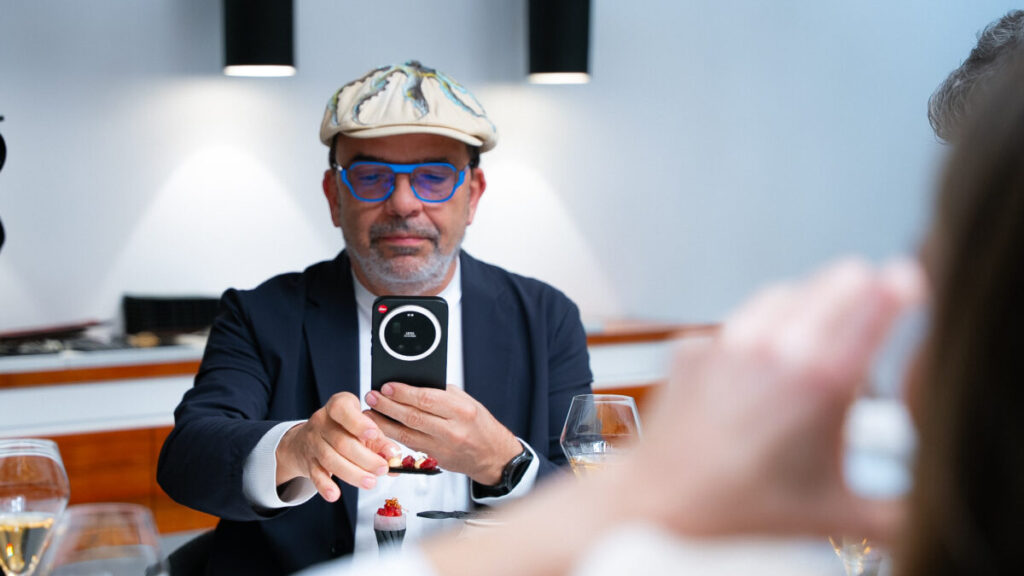 Bajo la luz natural que se cuela por el techo de Noor se presentan otras creaciones que son un viaje, como el bollo de bacalao seco con achicoria, la cuajada de gallina con su escabeche al azafrán, yema de huevo, dátil y caviar, o el pato ahumado curado y asado, acompañado de cerezas torrefactadas, hojas crujientes y tocinillo de cielo. A su lado, el Xiaomi 17 Ultra, más ligero, fino y resistente que los modelos anteriores, captura cada pase con total nitidez gracias a una configuración de lentes de gama alta con revestimiento multicapa, que ayuda a reducir los reflejos y permite que una luz más limpia llegue al sensor.