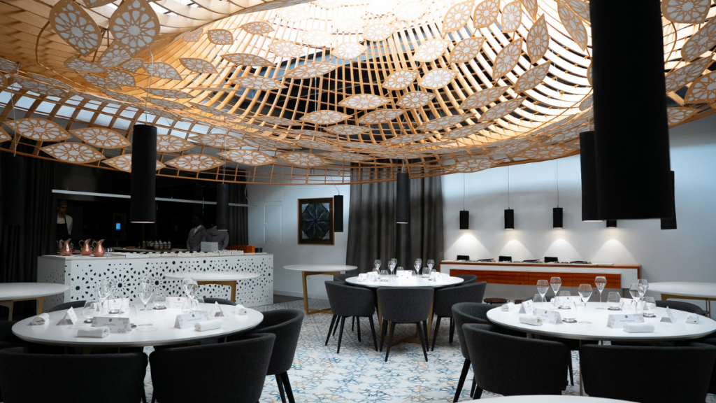 Esa motivación, aunar tecnología y alta cocina, es la que le ha servido a Morales de guía para diseñar el menú fath (que significa ‘apertura’ en árabe), creado en exclusiva para la ocasión. Un despliegue de aromas a romero, azafrán y limón que despiertan los sentidos y el nervio creativo. En esa sucesión de platos, destaca el ‘Karim de pistacho’ con manzana verde y huevas de arenque ahumadas, que cuenta con su propio maridaje fotográfico. Así, la primera imagen, en la que se observan unas manos trabajando la masa, representa el trabajo del panadero que comienza a las cinco de la mañana, puntual. Continúa con los cimientos de hace 1300 años, que marcan un sabor que perdura; y termina con la representación de una amplia extensión de verde, como ese campo que “es testigo de los pasos de los hombres en busca del oro líquido”.